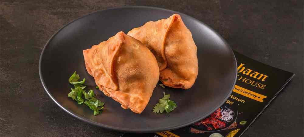 Savory pastry filling of spiced potatoes and green peas served with mint chutney and sweet chutney (Vegetable / Chicken / Beef / Baked)