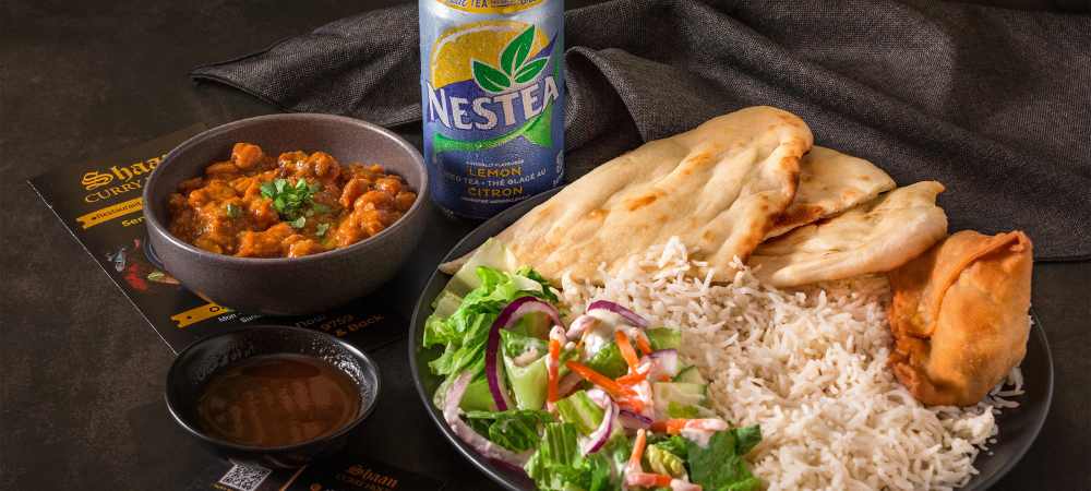 1 Choice of Curry [Veg or Non Veg] Served with Lentils, Rice, Salad, 1 Naan Bread, 1 Samosa, 1 Gulab Jamun & Signature Sauces & Green Chutney.